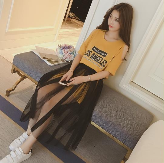 春夏季套装裙新款韩版露肩字母短袖t恤连衣裙女网纱半身裙两件套