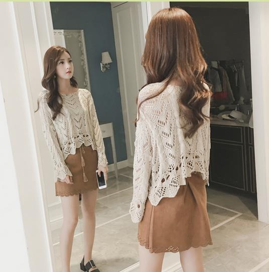2017春装新款套装裙宽松镂空毛衣针织罩衫+鹿皮绒半身短裙两件套