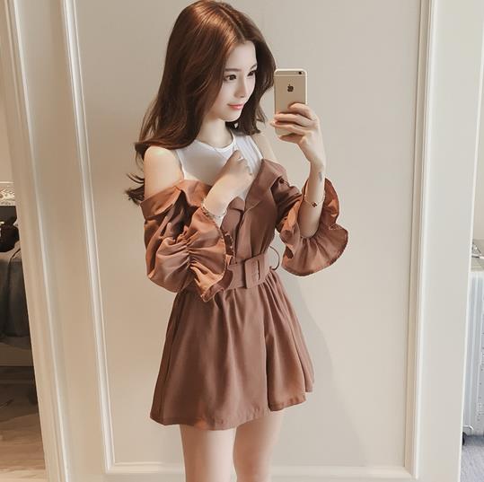 2017春季新款韩版时尚假两件纯色收腰连体裤女露肩宽松阔腿短裤潮