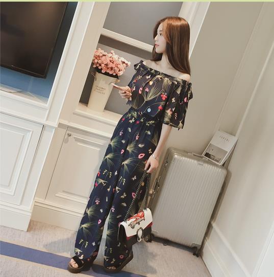 2017春季新款韩版一字领绑带蝴蝶结休闲裤女装中袖收腰印花连体裤