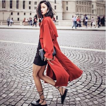 1.韩版休闲风衣。女神款重磅来袭!在经过明亮色系狂轰滥炸之后,设计师们将目光投向了沉稳低调却又饱含优雅情调的红色。暖意十足的红色不论搭配什么基本色都是不二之选,装进去满满的女神范儿~~