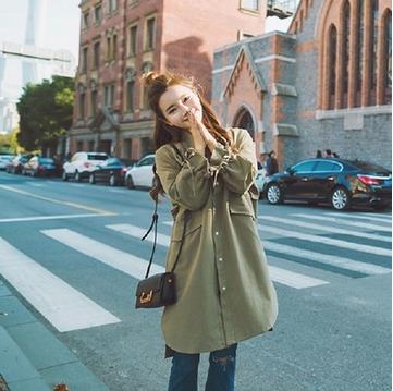 7.军绿改颜换面从头出发,轻松get最in发型!色喇叭袖风衣。军绿色是当前最流行的颜色,喇叭袖既可以遮挡手背上的肉肉,又美观大方。搭配牛仔裤,韩范清新,是学生党的不二之选。