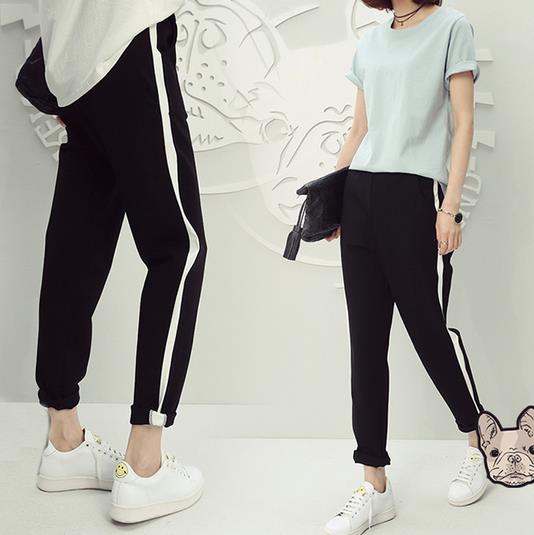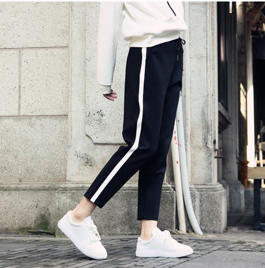 宽松白边运动裤女九分裤显瘦哈伦裤学生2017春休闲萝卜裤侧条纹裤