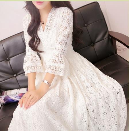 ◆森女七分袖绣花蕾丝收腰长裙