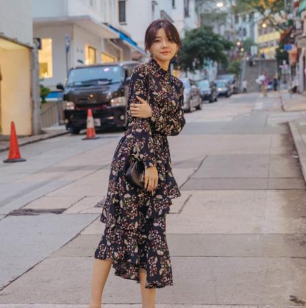 2017新款春秋韩版春装荷叶边雪纺碎花连衣裙女显瘦长袖时尚不规则
