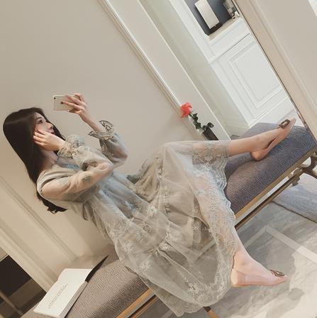 2017新款欧根纱长裙仙气裙子女夏韩版长袖纱裙连衣裙中长款春秋潮