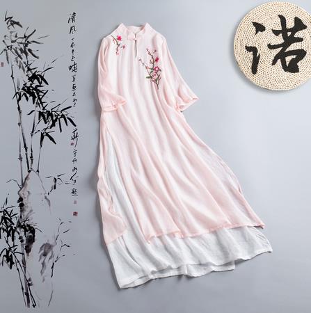 复古中国风立领盘扣双层棉麻纱绣花连衣裙夏七分袖仙女长裙文艺范