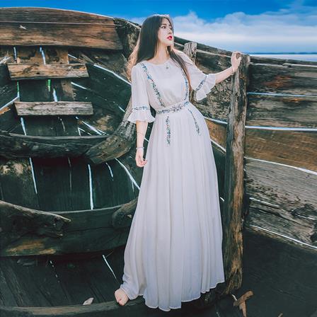 春夏装文艺范复古森女刺绣显瘦连衣裙波西米亚大摆度假沙滩长裙仙