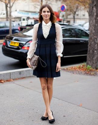 Alexa Chung用复古俏皮的透视白衬衫搭配黑色背带裙,黑白配出唯美感,少女与轻熟风的完美结合。