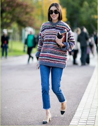 Eva Chen这套装扮融合了日常与奢华,彩条纹毛衣很有印象派视觉艺术效果,上边宽松繁复,下装就用修身简洁来平衡,是简单接地气、优雅有活力的实用一招。