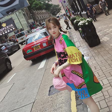 带来巨大冲击力的大色块撞色拼接,以及原宿风卡通印花,轻松占有别人的目光!脑子里瞬间蹦出来好几种搭配方法,你可以嘻哈风,搭配简单粗暴的配饰,带个棒球帽,画个欧美妆,一个嘻哈gilr就诞生啦