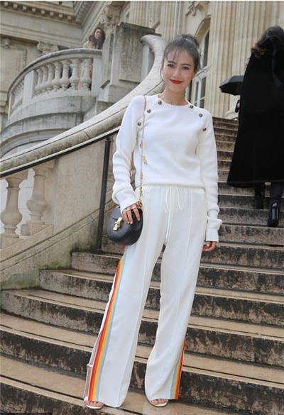 白色毛衣搭配白色条纹运动裤,一身白很高级,阔腿的裤管设计完全让小粗腿“躲”了起来