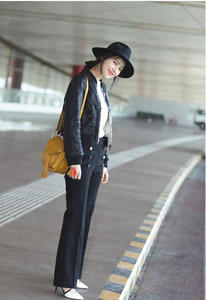 黑色高腰阔腿小西裤搭配短夹克,脚踩高跟鞋,小粗腿也变身大长腿~~肩背的黄色包包,打破了黑色的无聊