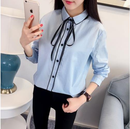2017春季新款韩版简约小清新翻领系带纯棉衬衫纯色长袖打底衬衣女