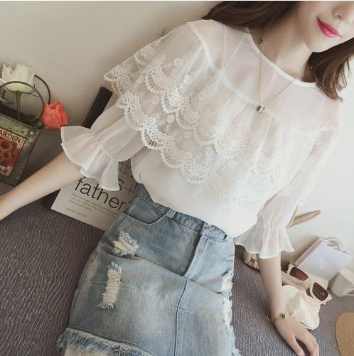 2017新款女装性感透视蕾丝拼接喇叭袖雪纺衫女夏短款宽松打底衫潮