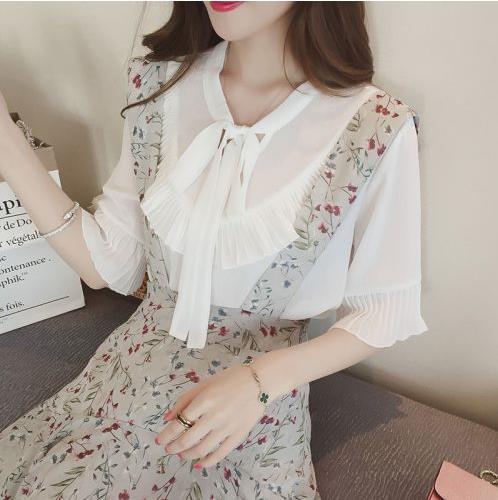 夏季新款甜美系带蝴蝶结五分袖雪纺衫女荷叶边宽松衬衫短袖打底衫