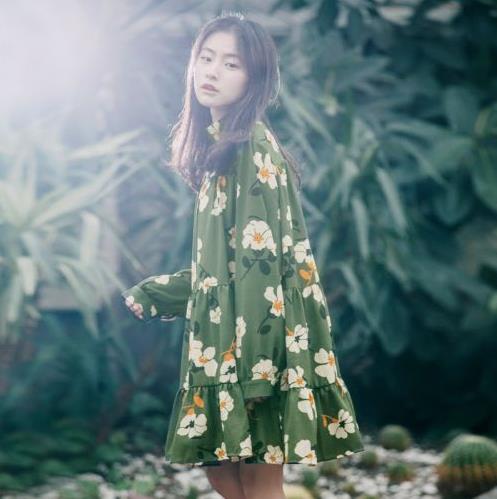 这是一款非常适合小个子女生的雪纺裙,不过膝盖的长度娇小妹子也能完全驾驭哦!大花朵图案很有春天的感觉,宽松的A字版型加上荷叶边的裙摆,非常灵动可爱哦!