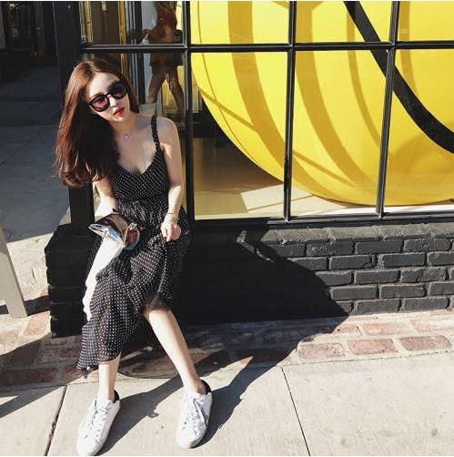韩版波点露背雪纺吊带连衣裙夏长款打底网纱裙