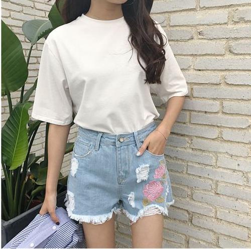 高腰牛仔短裤女春夏季2017新款学生白色毛边宽松韩版刺绣破洞热裤