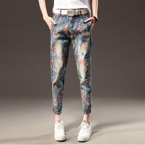 哈伦裤新款潮水洗磨白彩绘牛仔小脚香蕉裤花裤子宽松大码
