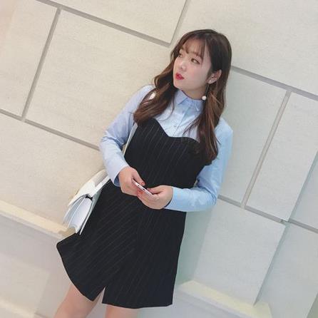 2017装新品胖MM显瘦气质假两件套衬衫条纹连衣裙