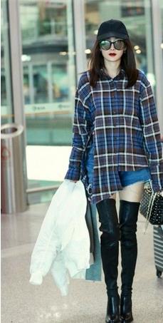 格子衬衫,个性十足的不规则衣摆裁剪,十分漂亮,搭配高腰牛仔短裤,穿上过膝长筒靴,露出一截大白腿,美极了。