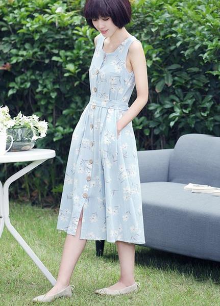 轻复古棉麻印花无袖长裙