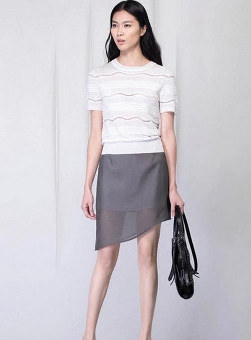 在一片耀眼夺目的亮色之中,浅灰色反倒让你燥热不安的心瞬间平静下来,这时候短裙的优势就显现出来了,如果是一条灰色的连衣裙,搁在五光十色的夏季就会有点格格不入,借助欧根纱的透视美感与不对称的裙摆,灰色短裙除了清凉,还蕴含着无穷的意味。