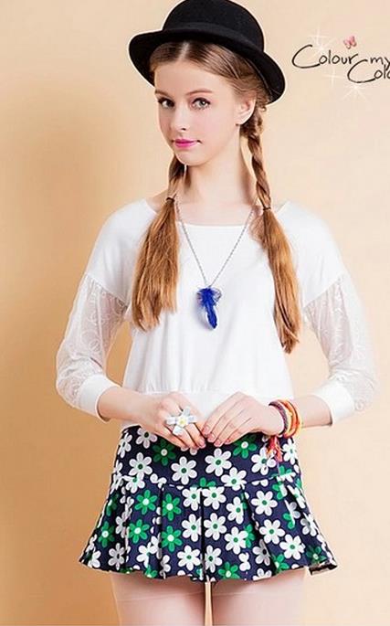长度在膝盖以上的短裙非常具有少女轻盈活泼的特点,减龄效果由此可见一斑,简洁缤纷的小花朵覆盖整条短裙,浪漫清新的气息迎面而来,将上衣塞进裙子里,短裙的美得以充分展现。