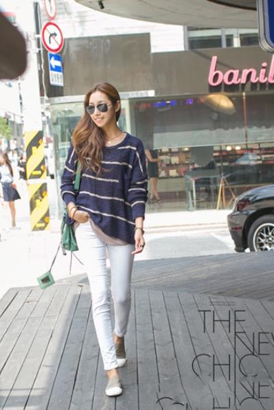 很简洁的版型设计,蓝白相交的条纹很时尚,衣服宽松的设计给行动带来方便,非常休闲的白色裤子,自然清新的感觉,似乎让我们感受到了秋季的色彩。