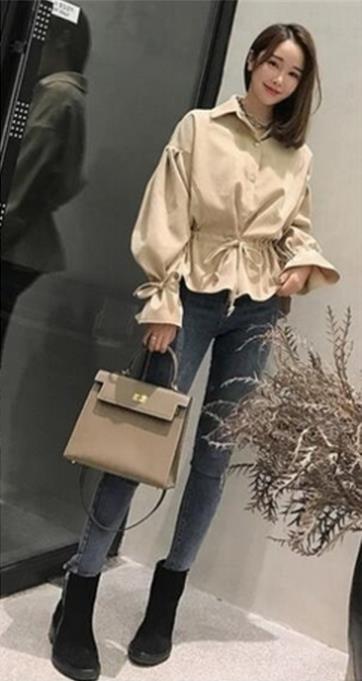 春季的天气非常好,衬衫也能穿起来了,这款衬衫很有特色,灯芯绒的面料是不是很有复古的气息?加上系带的设计,立显腰线超级显瘦,搭配着一条小脚牛仔裤,让胖女孩看起来时尚又不失甜美感。