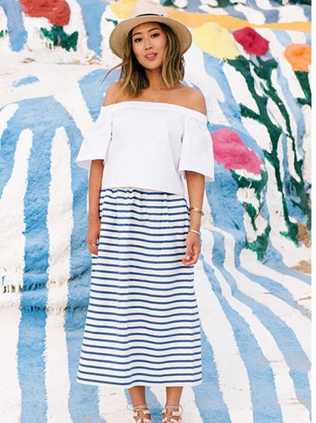 胖人穿衣搭配:娃娃装一字肩上衣+条纹伞裙+度假风草帽