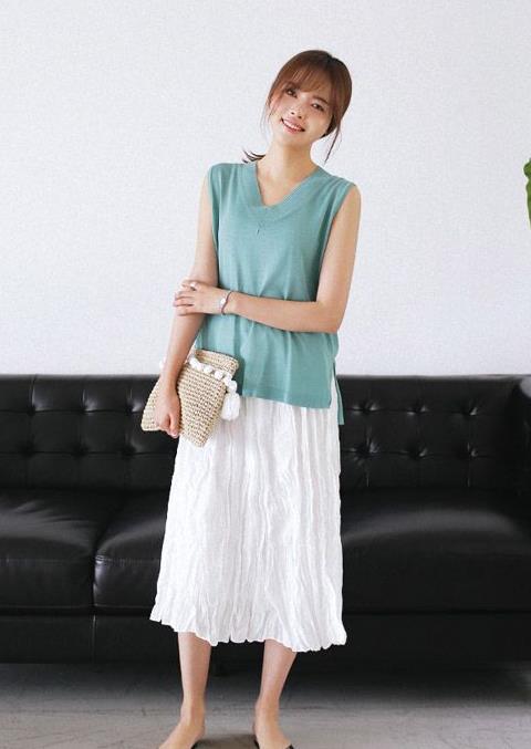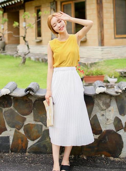 雪纺材质的白色半身长裙,还是经典的百褶设计,轻盈柔美,仙范十足,配黄色无袖T恤明媚可人,整个人看着更加俏皮活泼 ,尽显少女甜美。