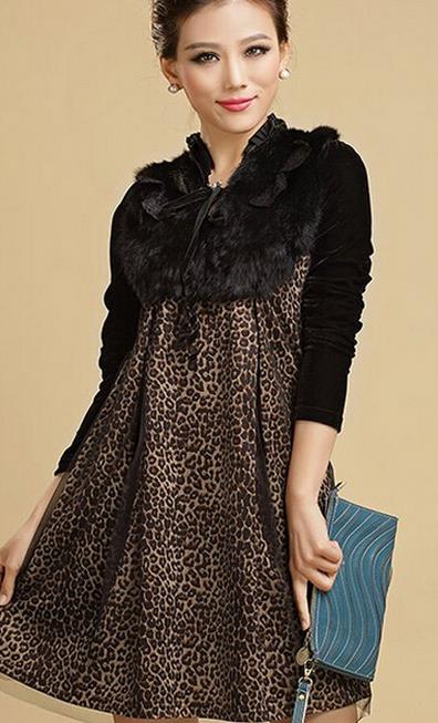 提腰款式的裙子,性感的豹纹元素加上黑色透明丝质双层设计,性感又特显高挑,上身搭配一款兔毛的披肩衣衣,更是显出女性的高贵与端庄。