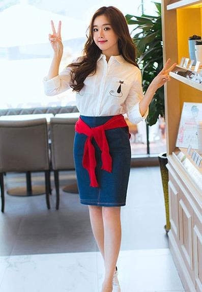 简洁大方的白色长袖衬衫,利落小翻领,胸前口袋小猫咪装饰萌趣可爱,增添俏皮活力,搭配包臀牛仔半身裙,很优雅很时尚。