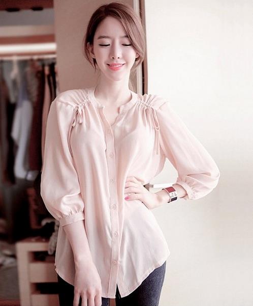 初次看见你,就觉得你长得有点不一样。本应该处于肩膀正上方的细密收褶稍稍向下挪移,配合着简单的小立V领,瞬间就将自己与大部分的衬衫区分开来。微蓬的灯笼中袖与宽松版型,裸色系的通勤想温柔,看,挺容易。