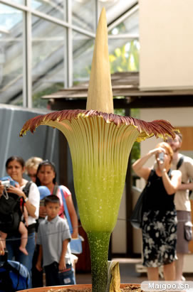 2006年8月11日,在美国纽约布鲁克林植物园,观众们对第一次盛开的珍稀濒危植物——巨海芋(Amorphophallus titanum)拍照。由于它开放时会释放一股类似腐烂肉的奇臭气味,因此又被称为“尸花”。巨型海芋生长速度非常快,甚至一天时间可增长6-7英寸。